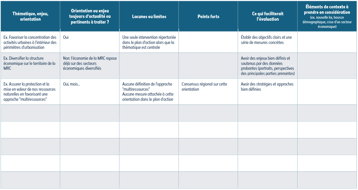 Complétez le tableau suivant en vous référant aux grandes thématiques, orientations ou enjeux structurant le schéma actuel de votre MRC. Les énoncés sont intégrés à titre d’exemples.