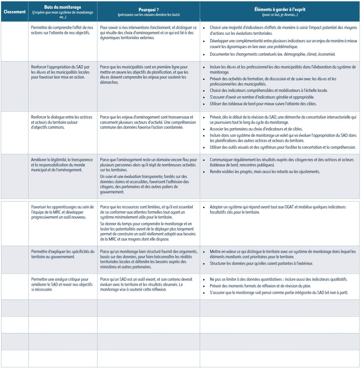 En vous basant notamment sur le bilan de votre planification en vigueur (Question 1), classez (de 1- le plus prioritaire à 3- le moins prioritaire) les propositions du tableau suivant en trois buts prioritaires pour votre système de monitorage. Si vous identifiez d’autres buts valables pour votre MRC, ajoutez-les dans les cases vides en prenant soin de préciser les raisons ainsi que les éléments qui vous semblent importants à garder à l’esprit. (Exercice adapté de : Lalande et al., 2025).