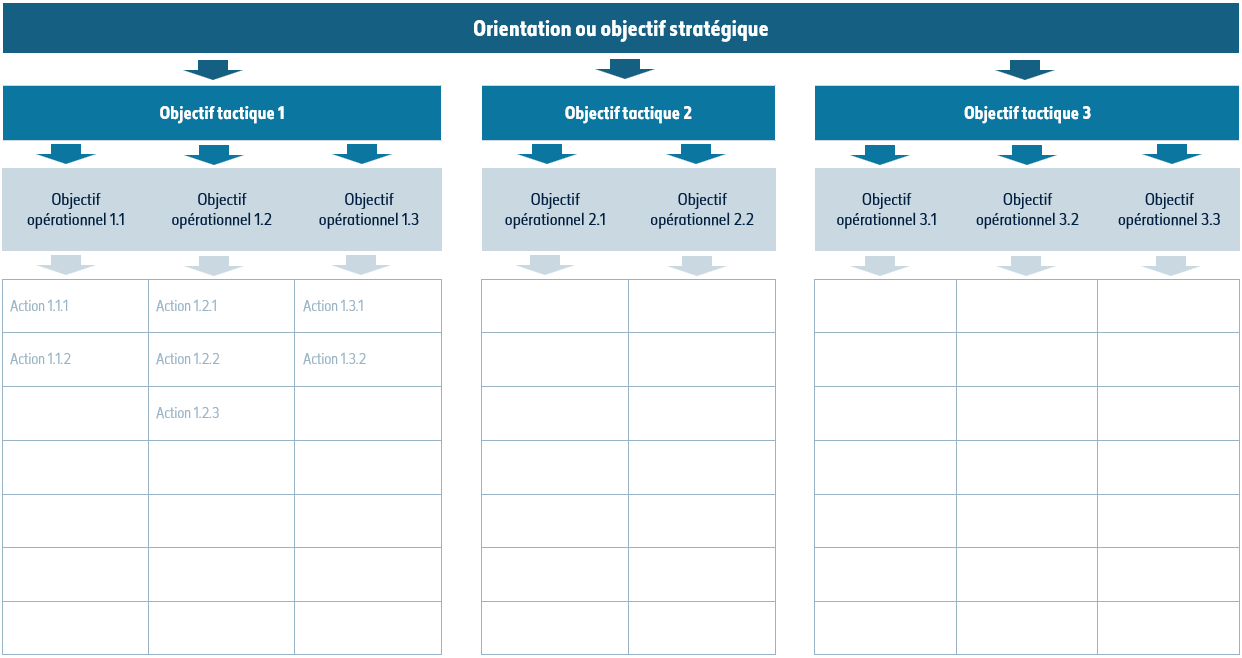 À l’aide du tableau suivant, classez les objectifs que vous avez formulés pour votre planification du plus stratégique au plus opérationnel : définissez des orientations (ou objectifs stratégiques), auxquelles seront associés des objectifs tactiques, se déclinant eux-mêmes en différents objectifs opérationnels et actions possibles.