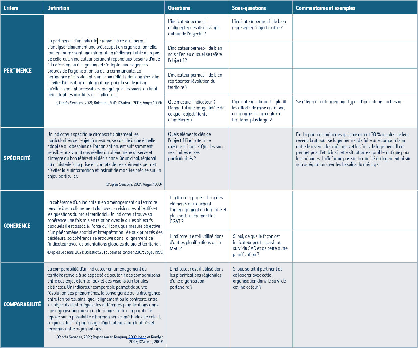 Le tableau suivant présente une série de critères de sélection d’indicateurs portant sur leur adéquation avec les objectifs de planification et les besoins de la MRC. Chaque critère est accompagné d’une définition et décliné en différentes questions, sous-questions et précisions ou exemples. Dans cet exercice, nous vous proposons de mettre en relation votre première sélection d’indicateurs (Question 4) avec les objectifs que vous considérez comme prioritaires pour votre MRC (Exercice 5.1). Cette première sélection pourrait être bonifiée en explorant la banque d’indicateurs développée par l’OTERAUD.