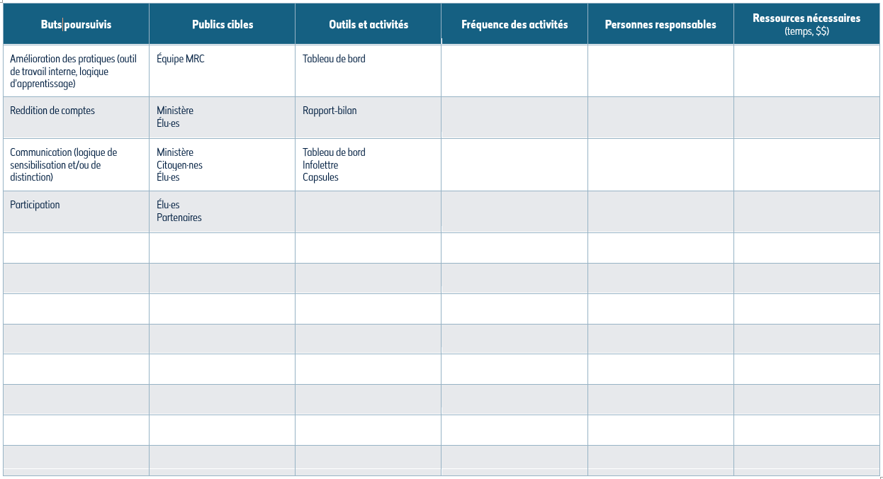 La dernière étape de l’élaboration du système de monitorage consiste à planifier les activités et les ressources nécessaires à sa mise en œuvre. Il importe ici de revenir aux buts et aux usages attribués au monitorage pour votre MRC (Question 2). En effet, les buts préalablement établis orientent la nature, l’ampleur et la fréquence des activités de monitorage. Selon que l’on cherche à améliorer les pratiques internes, rendre des comptes, démontrer l’impact des actions, valoriser les spécificités du territoire ou encore soutenir la participation, le choix d’activités et les ressources attribuées au suivi et à l’évaluation ne seront pas les mêmes.