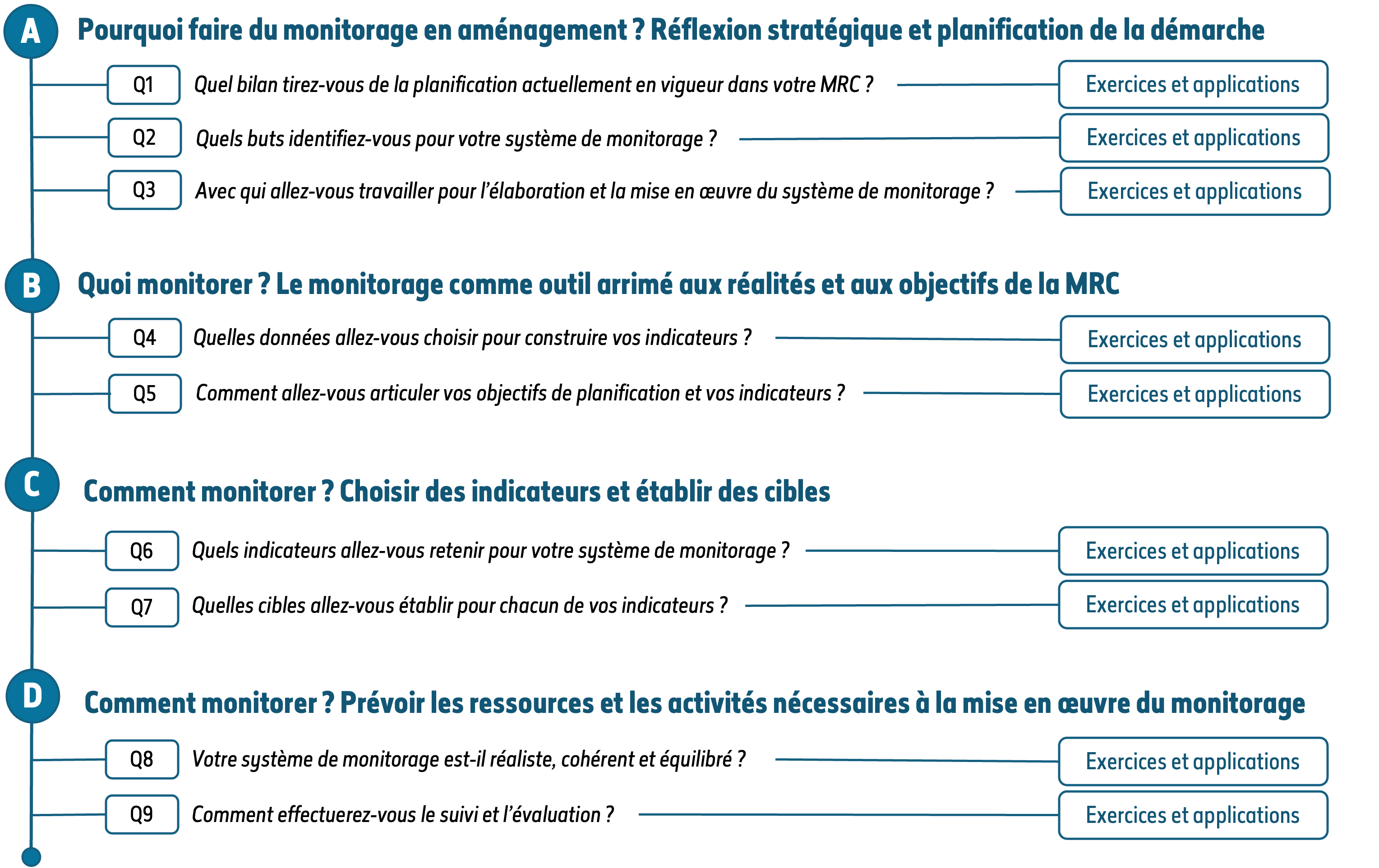 Le guide est ordonné selon une suite logique (Pourquoi ? Quoi ? Comment ?), mais on peut y entrer à partir de n’importe quelle section selon l’avancement de la révision du SAD. Des renvois sont faits vers les autres sections lorsque pertinent. La conception d’un système de monitorage en aménagement n’est pas un processus linéaire et il n’y a certainement pas une seule manière de procéder.